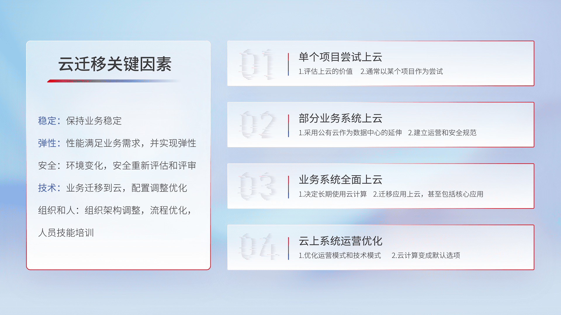 结合实际业务,,,从规划设计、、、、云平台选型、、、云原生改造、、、数据迁移、、集成交付,,,,迁移全过程为客户识别最佳上云路径,,,,做好风险识别管理,,,,设计网络架构、、、、身份权限、、、安全审计合规、、、、操作审计、、、、日志审计、、、监控告警策略、、、、多站点容灾设计等,,,,对云上基础设施进行整体规划,,,,提升IT治理水平,,,,以满足弹性、、、、高可用、、、高性能的需求。。。