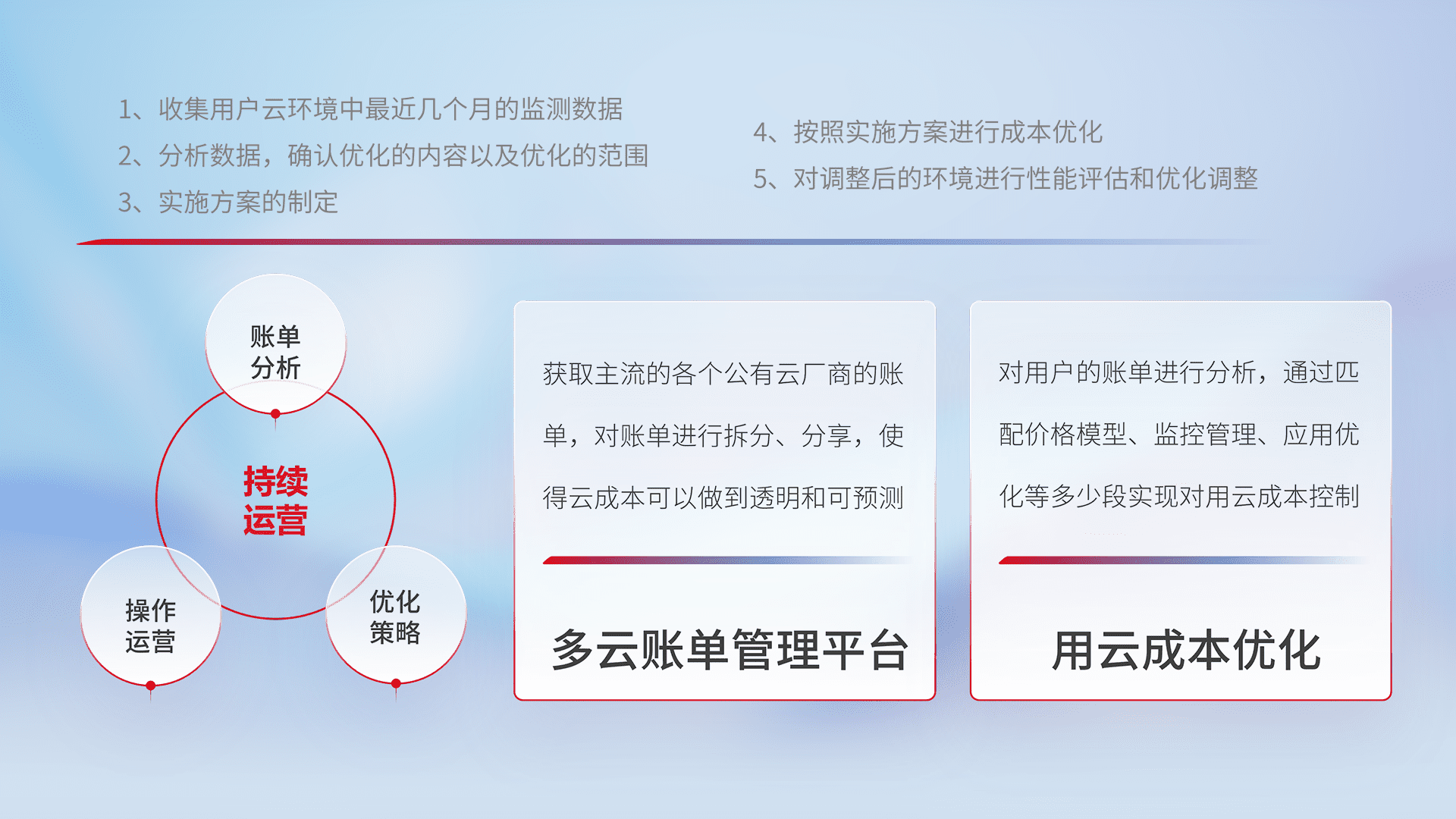 通过多云纳管,,以统一的资源数据模型把客户的云资源进行抽象和封装,,,进而实现对多云资源的统一操作,,,保障云资源管理的可靠性、、稳定性与可用性。。。。量身定制化运维内容,,,配置、、开发运维、、补丁管理、、备份、、监控、、、、认证和访问管理、、、审计和日常巡检等,,,保障在用云过程中的可靠度,,,,稳定度以及高可用率。。。
